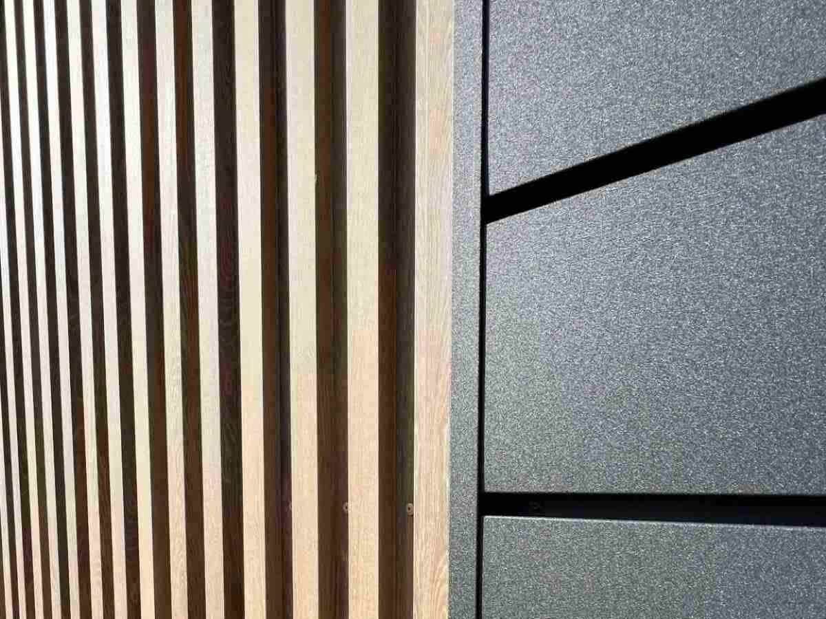 Fassadenverkleidung Außenseiten mit rechteckigen Blechen in RAL-Farbe, Holzoptik oder in Echtholz siehe Preis-Konfigurator.