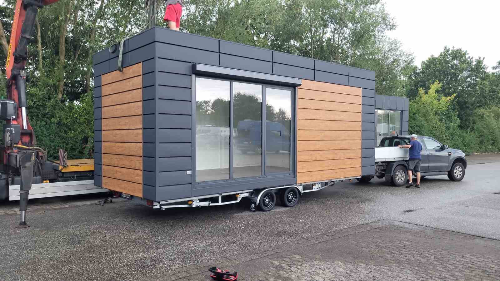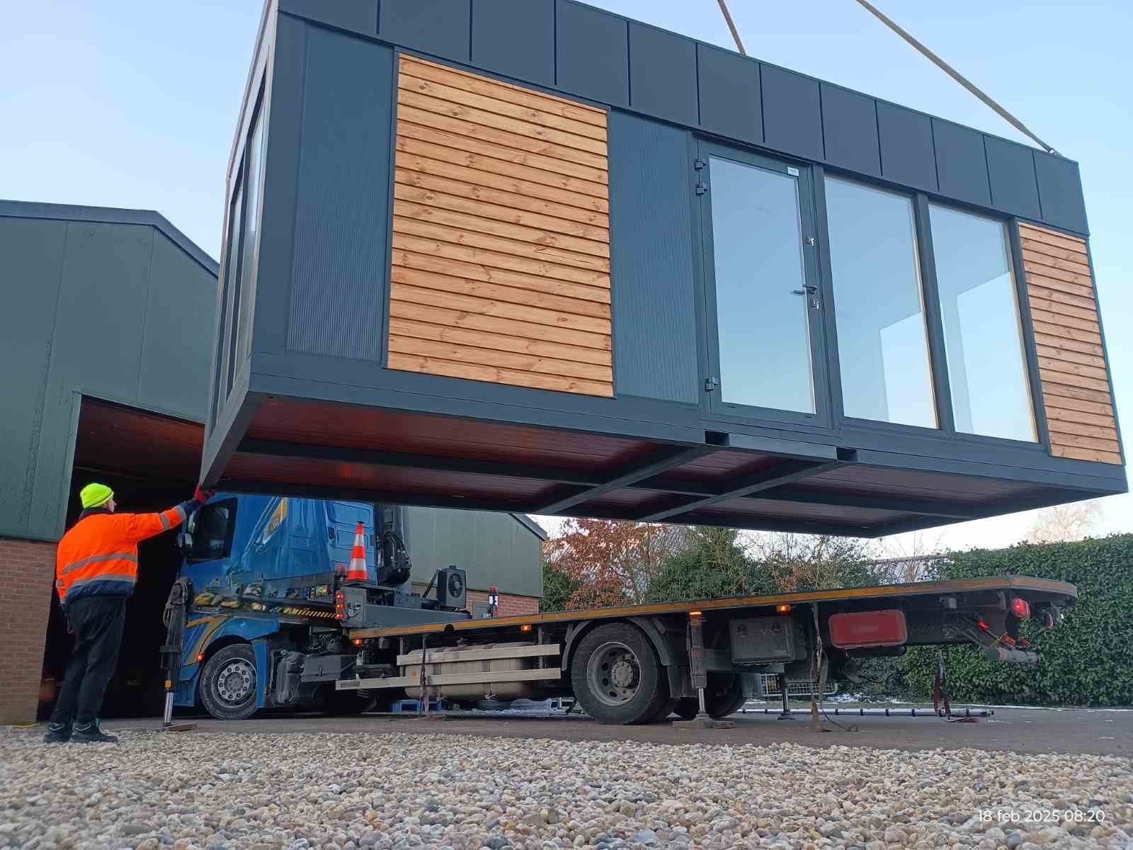 Es wird komplett fertig angeliefert und mit einem Kran bis 50m punktgenau abgestellt.