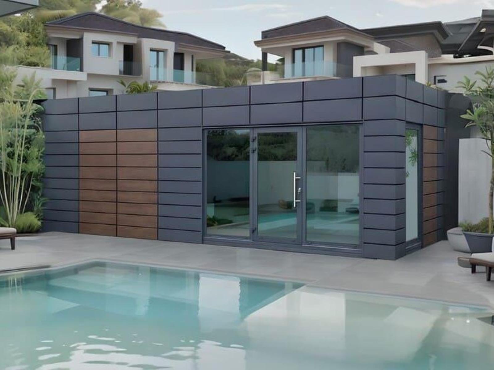 Der Container kann mit Holz verkleidet, gestrichen oder begrünt werden. Eine Terrasse oder Pergola ergänzt den Look perfekt.